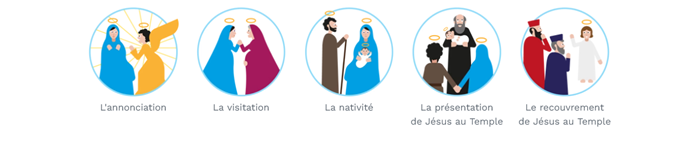 Ces mystères correspondent à la naissance et à l’enfance de Jésus.