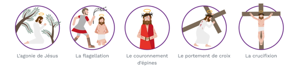 - 5ème mystère douloureux : le crucifiement et la mort de Jésus en croix. Le fruit de ce mystère est l’amour encore plus grand porté au Christ, mort pour notre salut.